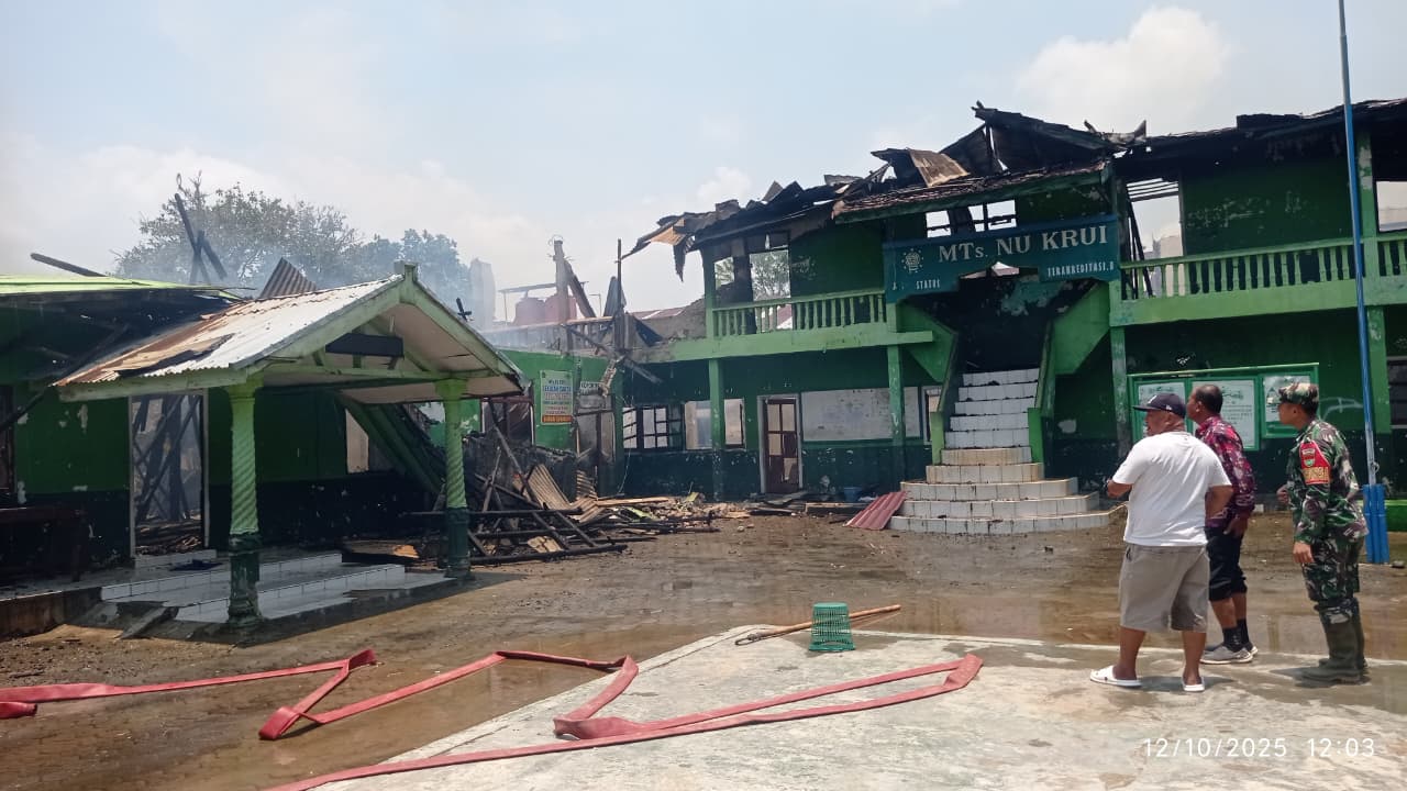 Halamantoday.com, Pesisir Barat– Kebakaran hebat melanda Madrasah Tsanawiyah Nahdlatul Ulama (MTs NU) Krui, Kabupaten Pesisir Barat, Minggu (12/10/2025) sekira pukul 11.30 WIB.