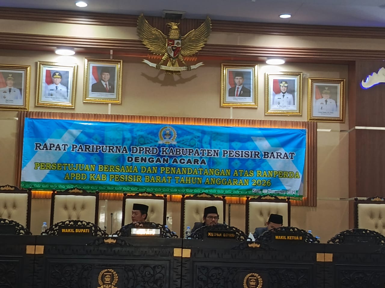 Pesisir Barat, (HalamantodayTV)– Dewan Perwakilan Rakyat Daerah (DPRD) Kabupaten Pesisir Barat menggelar rapat paripurna dengan agenda persetujuan dan penandatanganan Rancangan Peraturan Daerah (Ranperda) tentang APBD Tahun Anggaran 2026, Jumat (21/11/2025).